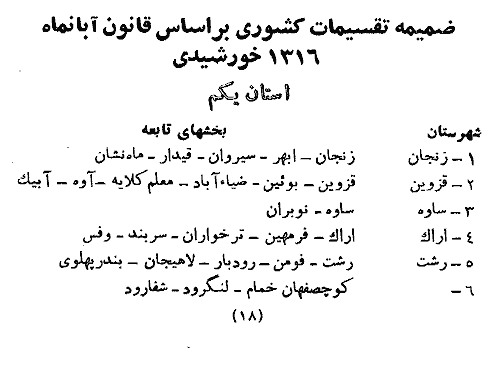 منبع: مقاله "اداره و تقسیمات کشوری ایران"، کاظم ودیعی، نشریه بررسی های تاریخی