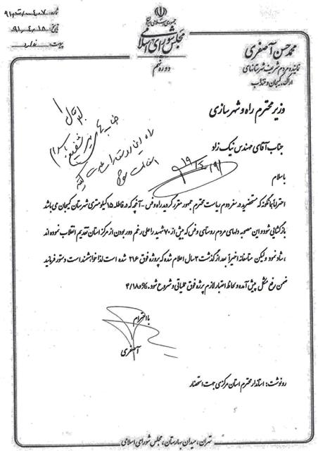 نامه آصفری به وزیر راه و شهرسازی در خصوص پیگیری و اقدام درباره پروژه راه وفس- آقچه شهرستان کمیجان و دستور وزیر برای اجرای آن(+)